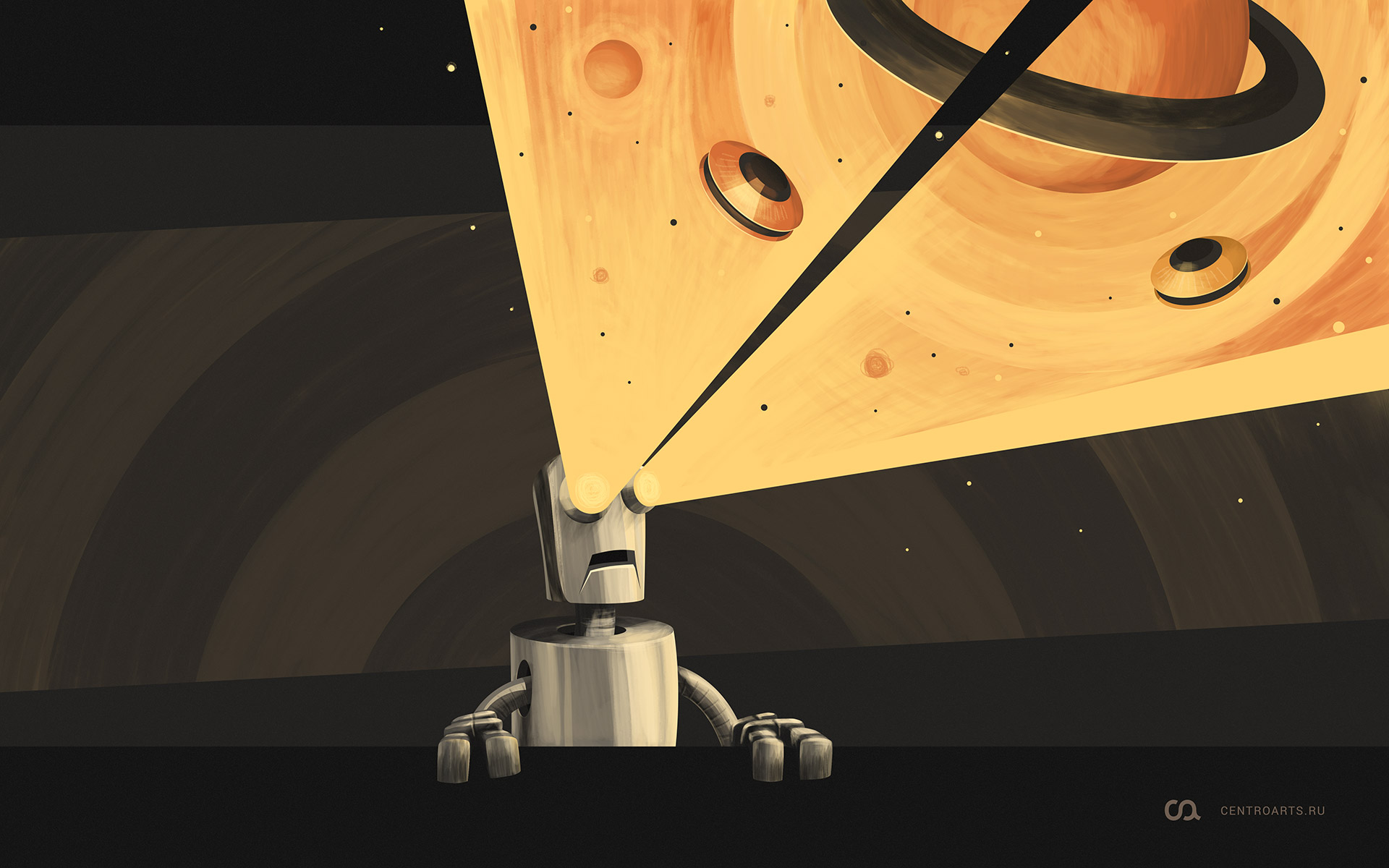 Обои для рабочего стола на тему мечты. Грезы, фантазии, мечты способны оживить самый мрачный мир, так и в этом сюжете. Мечты оживили серую реальность робота. Мечты о других мирах, недосягаемых планетах и галактиках. Оформление для рабочего стола разработано в продолжение роботематики.