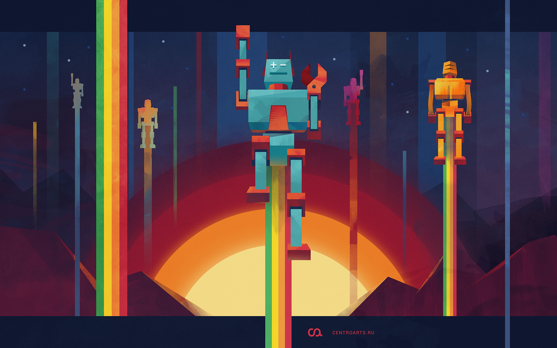 Обои для рабочего стола. Обои посвящены перезапуску и долгожданному обновлению сайта студии Centroarts. Главными героями выступают роботы. С этой работы запускается новый образ сайта, новые персонажи. Теперь роботы будут частью сайта.