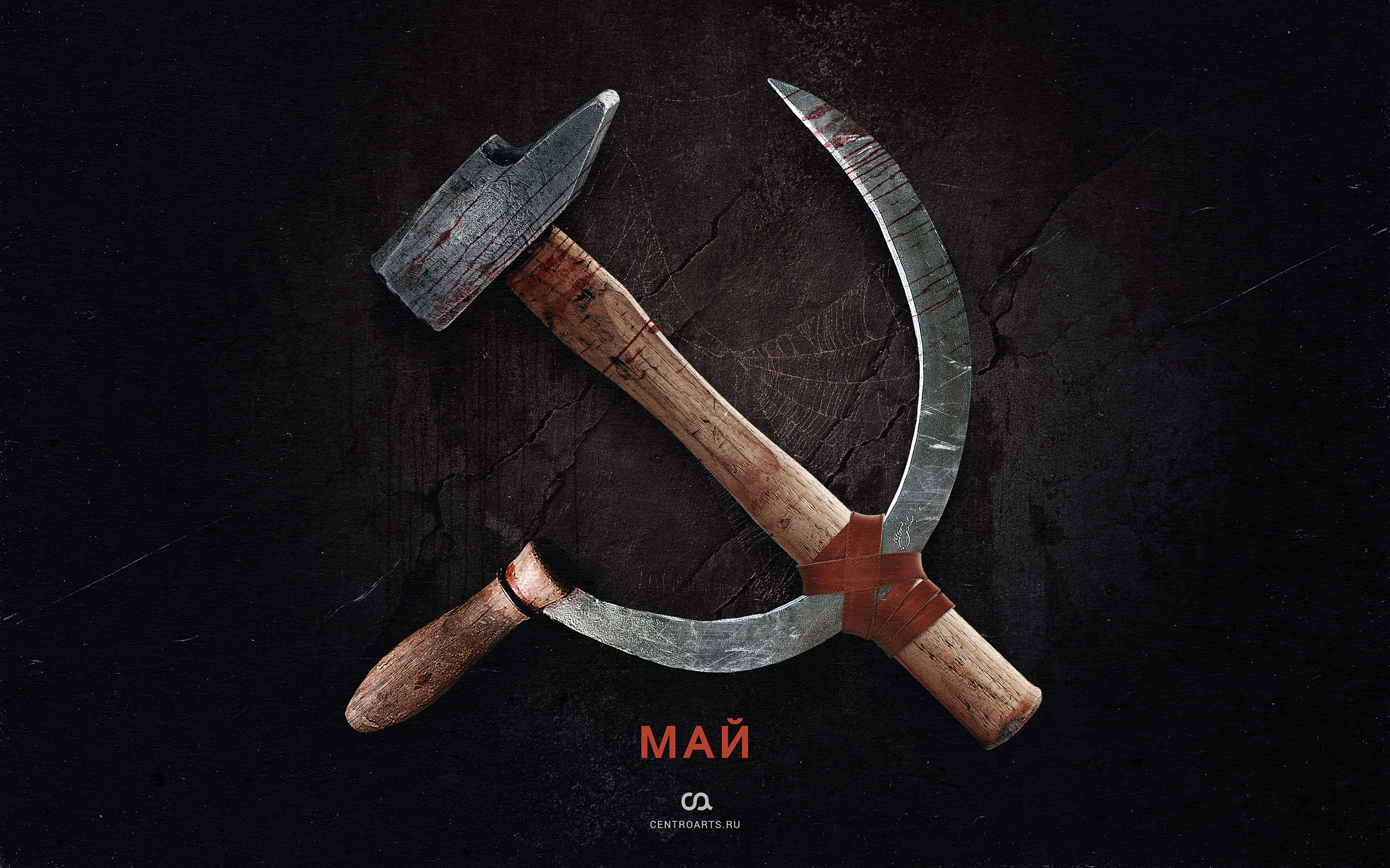 Новые обои для рабочего стола на май с тематическим оформлением: серп и молот в современной модификации. Тема работы мая - Мир! Труд! Май! Поздравляем Вас с праздником весны!